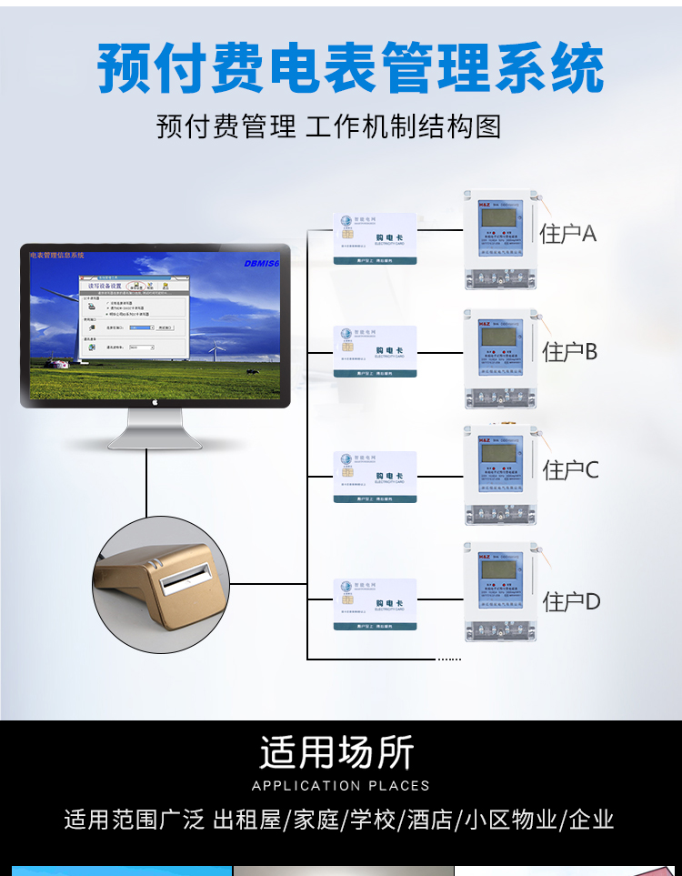 主要特點:應用計算機管理,先購電后用電;在額定電流范圍內(nèi)能限制最大使用功率(由供電部門限定);一表一卡,專卡專用,失卡不失電,補卡再用;電卡能雙向傳遞數(shù)據(jù),能自動斷電告警用戶購電;電量為零時,自動拉閘斷電;并具有一定的防竊電軟件設計等。